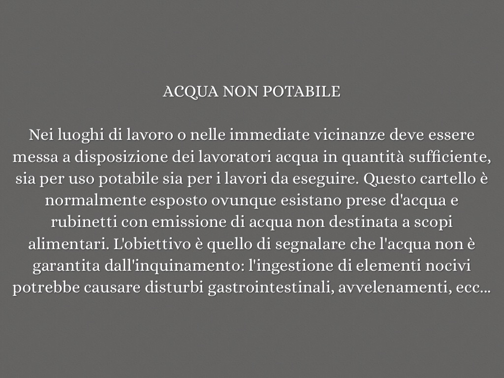 Nei luoghi di lavoro o nelle immediate vicinanze deve essere messa a disposizione dei lavoratori acqua in quantità sufficiente, sia per uso potabile sia per i lavori da eseguire. Questo cartello è normalmente esposto ovunque esistano prese d'acqua e rubinetti con emissione di acqua non destinata a scopi alimentari. L'obiettivo è quello di segnalare che l'acqua non è garantita dall'inquinamento: l'ingestione di elementi nocivi potrebbe causare disturbi gastrointestinali, avvelenamenti, ecc...