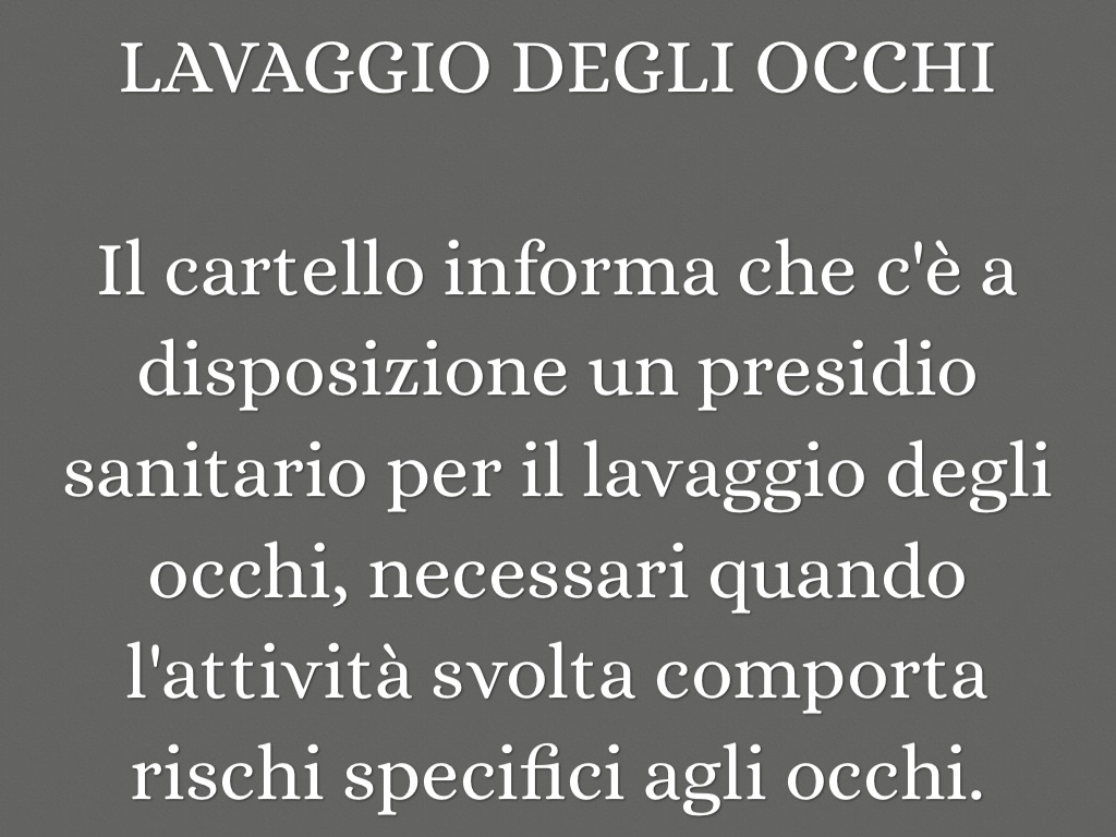 Il cartello informa che c'è a disposizione un presidio sanitario per il lavaggio degli occhi, necessari quando l'attività svolta comporta rischi specifici agli occhi.