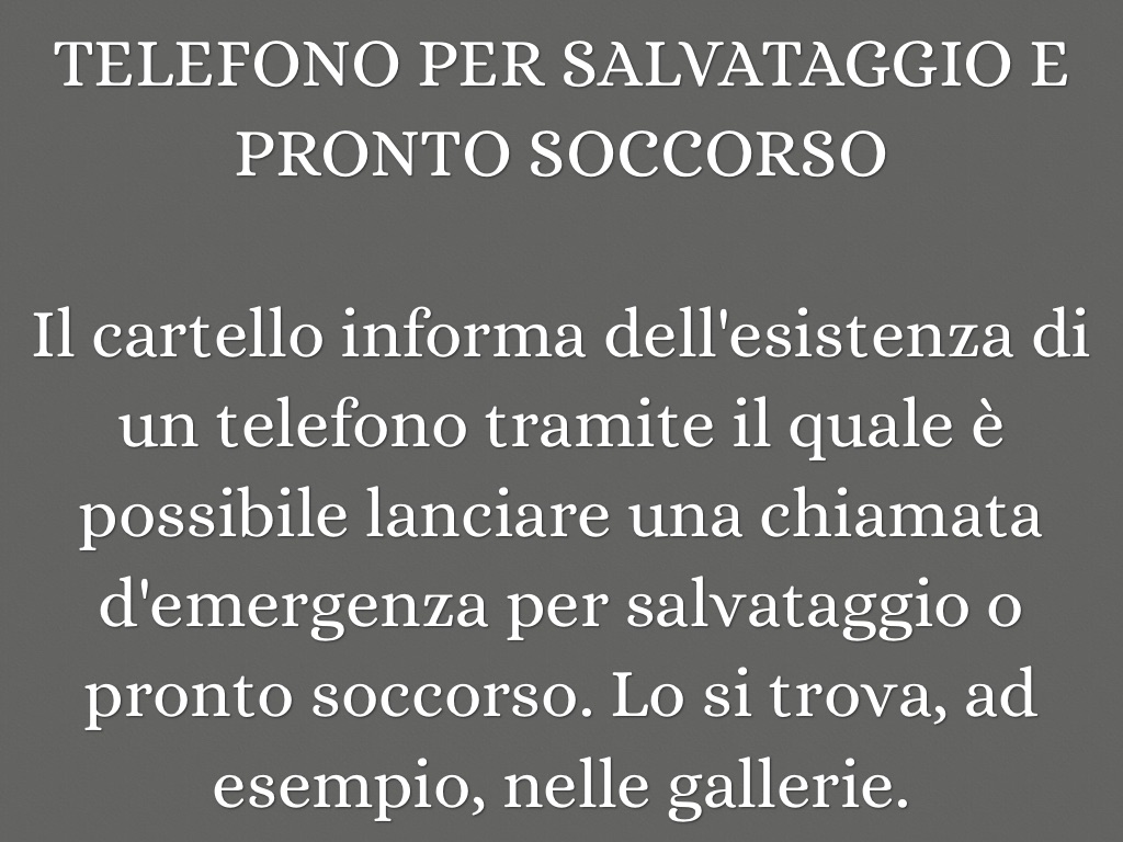 Il cartello informa dell'esistenza di un telefono tramite il quale è possibile lanciare una chiamata d'emergenza per salvataggio o pronto soccorso. Lo si trova, ad esempio, nelle gallerie.