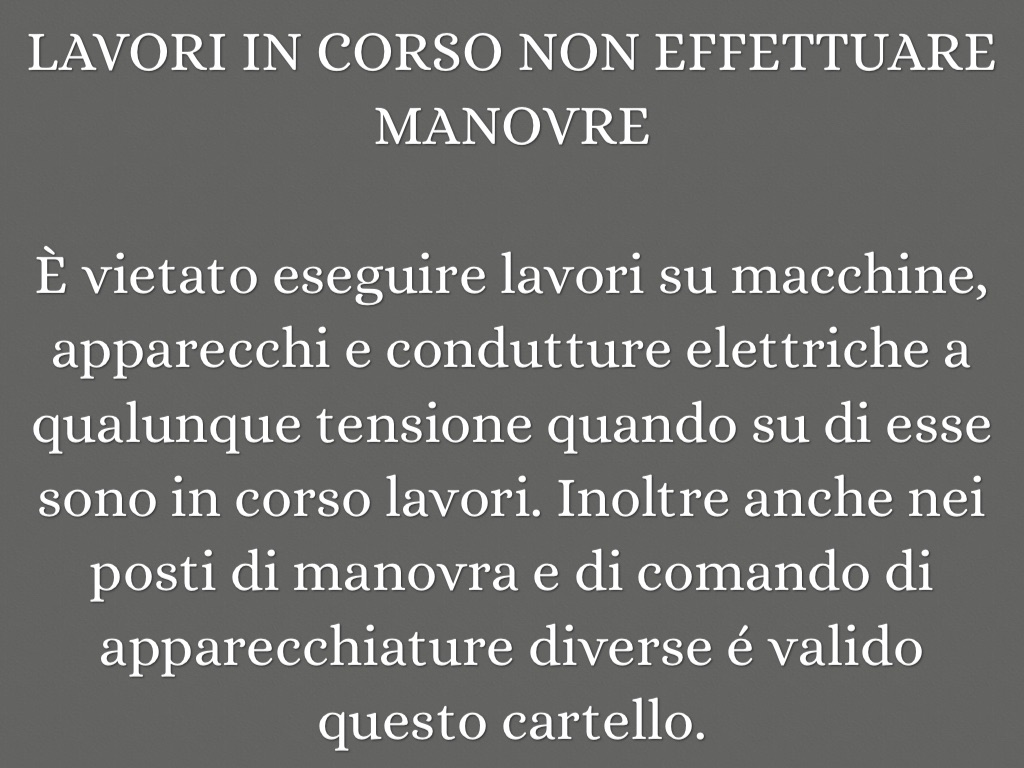 È vietato eseguire lavori su macchine, apparecchi e condutture elettriche a qualunque tensione quando su di esse sono in corso lavori. Inoltre anche nei posti di manovra e di comando di apparecchiature diverse é valido questo cartello.