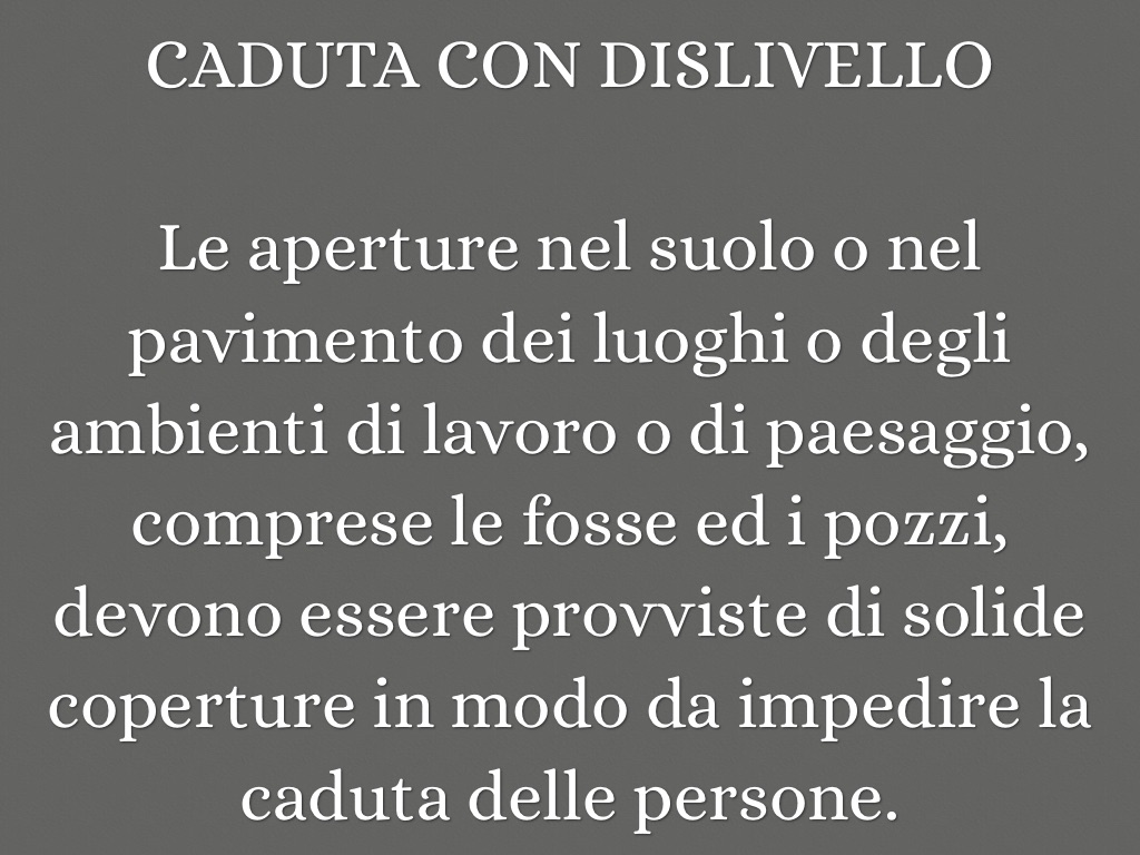 Le aperture nel suolo o nel pavimento dei luoghi o degli ambienti di lavoro o di paesaggio, comprese le fosse ed i pozzi, devono essere provviste di solide coperture in modo da impedire la caduta delle persone.