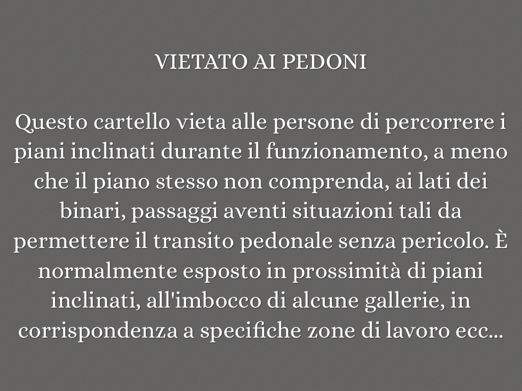 Questo cartello vieta alle persone di percorrere i piani inclinati durante il funzionamento, a meno che il piano stesso non comprenda, ai lati dei binari, passaggi aventi situazioni tali da permettere il transito pedonale senza pericolo. È normalmente esposto in prossimità di piani inclinati, all'imbocco di alcune gallerie, in corrispondenza a specifiche zone di lavoro ecc...