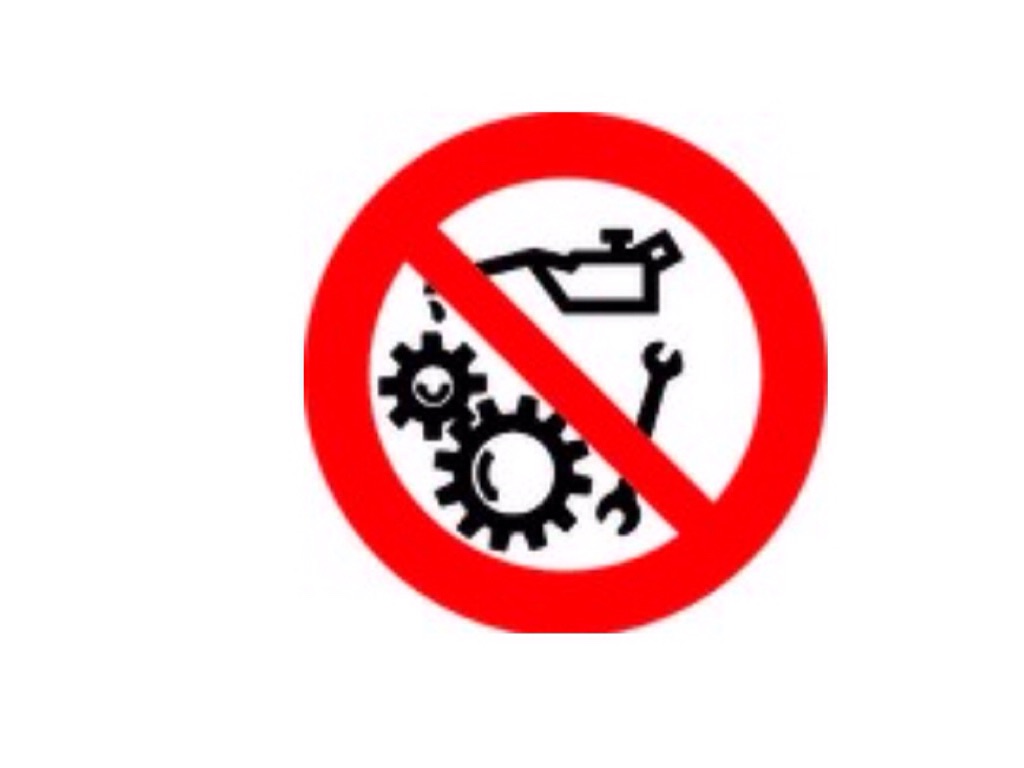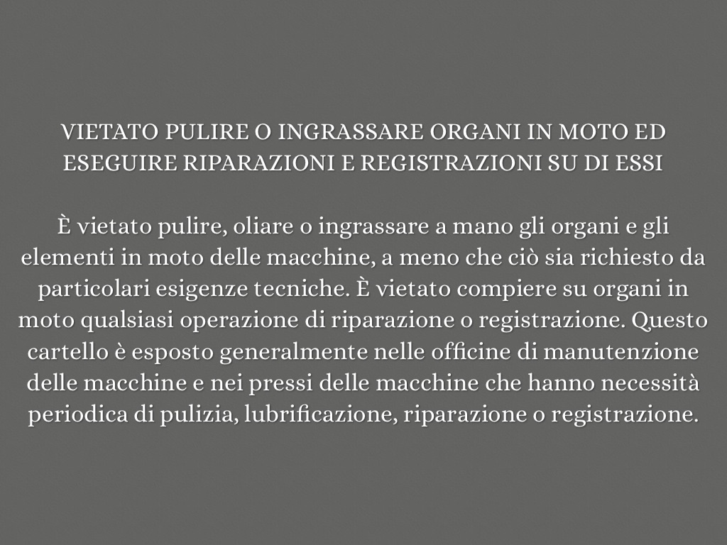 È vietato pulire, oliare o ingrassare a mano gli organi e gli elementi in moto delle macchine, a meno che ciò sia richiesto da particolari esigenze tecniche. È vietato compiere su organi in moto qualsiasi operazione di riparazione o registrazione. Questo cartello è esposto generalmente nelle officine di manutenzione delle macchine e nei pressi delle macchine che hanno necessità periodica di pulizia, lubrificazione, riparazione o registrazione.