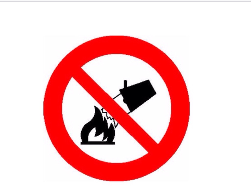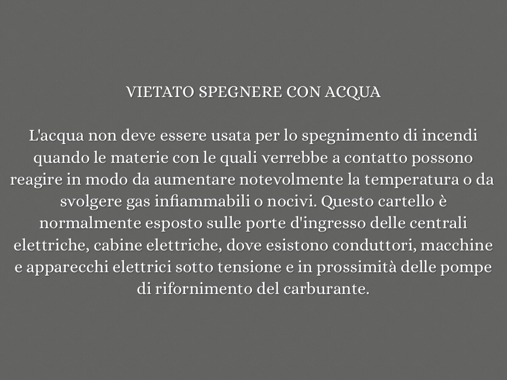 L'acqua non deve essere usata per lo spegnimento di incendi quando le materie con le quali verrebbe a contatto possono reagire in modo da aumentare notevolmente la temperatura o da svolgere gas infiammabili o nocivi. Questo cartello è normalmente esposto sulle porte d'ingresso delle centrali elettriche, cabine elettriche, dove esistono conduttori, macchine e apparecchi elettrici sotto tensione e in prossimità delle pompe di rifornimento del carburante.