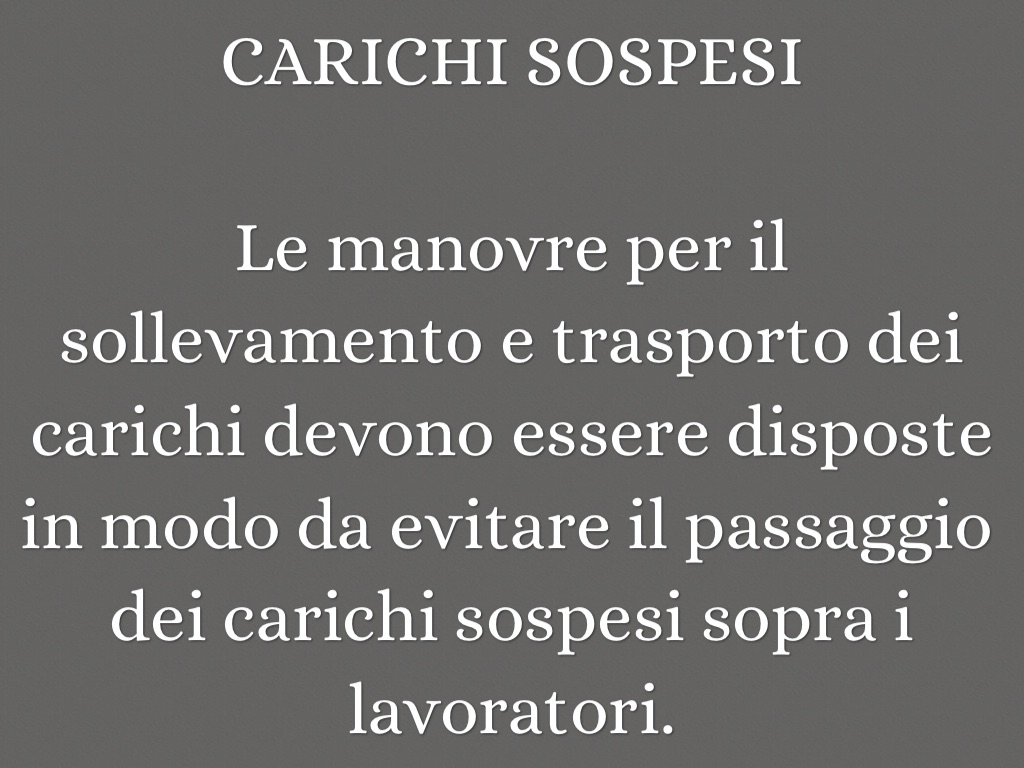 Le manovre per il sollevamento e trasporto dei carichi devono essere disposte in modo da evitare il passaggio dei carichi sospesi sopra i lavoratori.