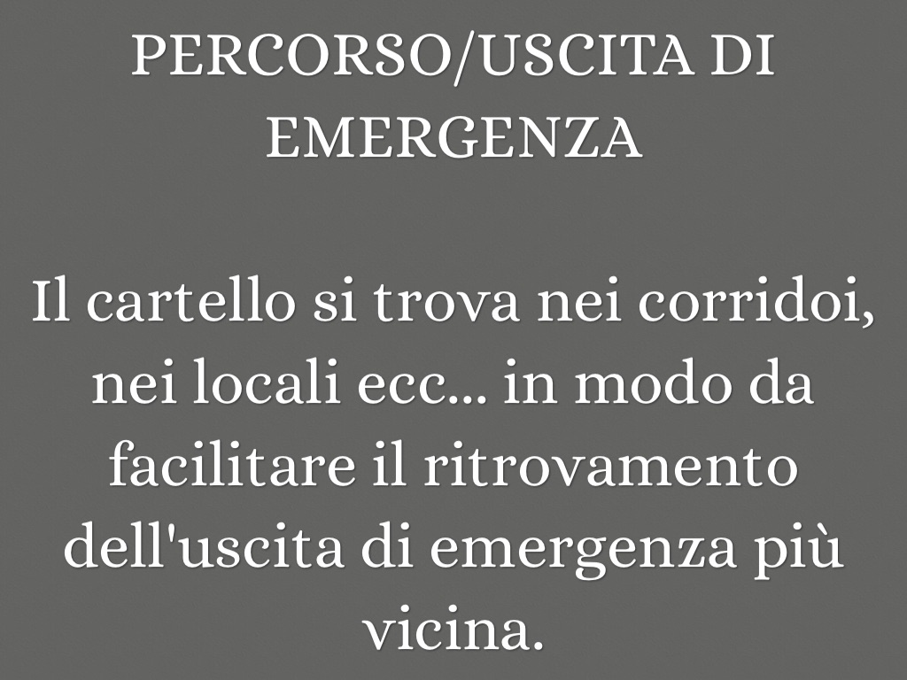 Il cartello si trova nei corridoi, nei locali ecc... in modo da facilitare il ritrovamento dell'uscita di emergenza più vicina.