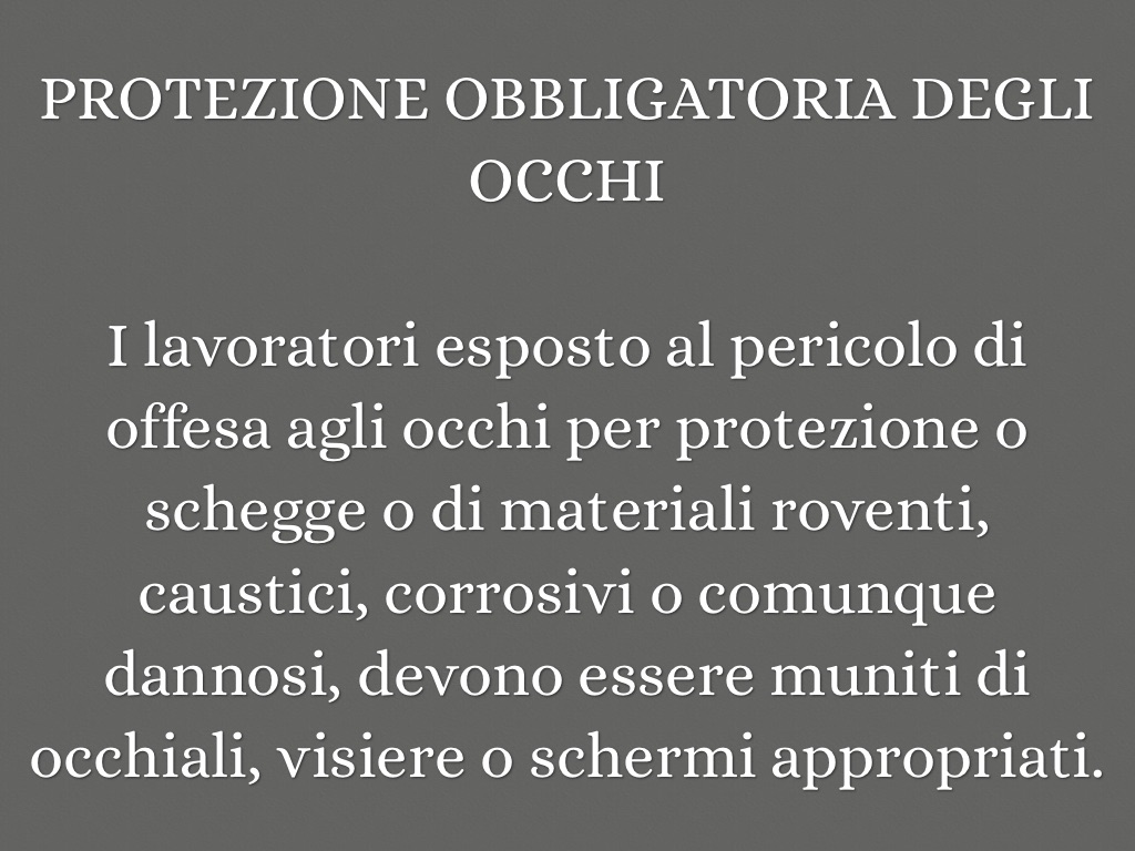 I lavoratori esposto al pericolo di offesa agli occhi per protezione o schegge o di materiali roventi, caustici, corrosivi o comunque dannosi, devono essere muniti di occhiali, visiere o schermi appropriati.