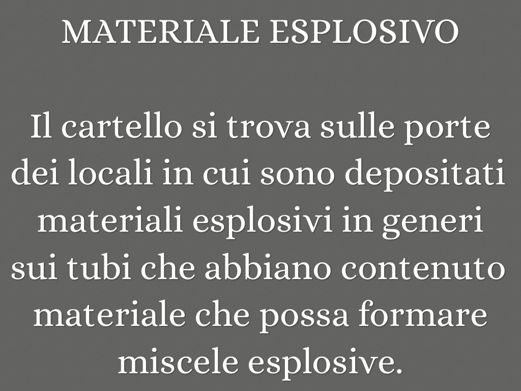 Il cartello si trova sulle porte dei locali in cui sono depositati materiali esplosivi in generi sui tubi che abbiano contenuto materiale che possa formare miscele esplosive.