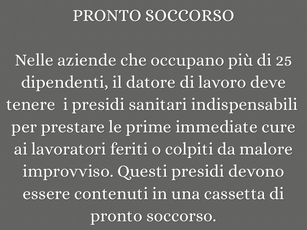 Nelle aziende che occupano più di 25 dipendenti, il datore di lavoro deve tenere i presidi sanitari indispensabili per prestare le prime immediate cure ai lavoratori feriti o colpiti da malore improvviso. Questi presidi devono essere contenuti in una cassetta di pronto soccorso.