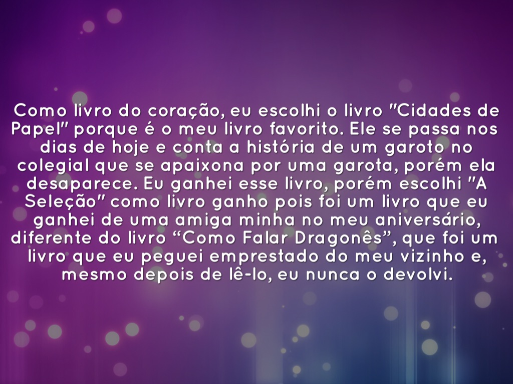Como livro do coração, eu escolhi o livro "Cidades de Papel" porque é o meu livro favorito. Ele se passa nos dias de hoje e conta a história de um garoto no colegial que se apaixona por uma garota, porém ela desaparece. Eu ganhei esse livro, porém escolhi "A Seleção" como livro ganho pois foi um livro que eu ganhei de uma amiga minha no meu aniversário, diferente do livro “Como Falar Dragonês”, que foi um livro que eu peguei emprestado do meu vizinho e, mesmo depois de lê-lo, eu nunca o devolvi.