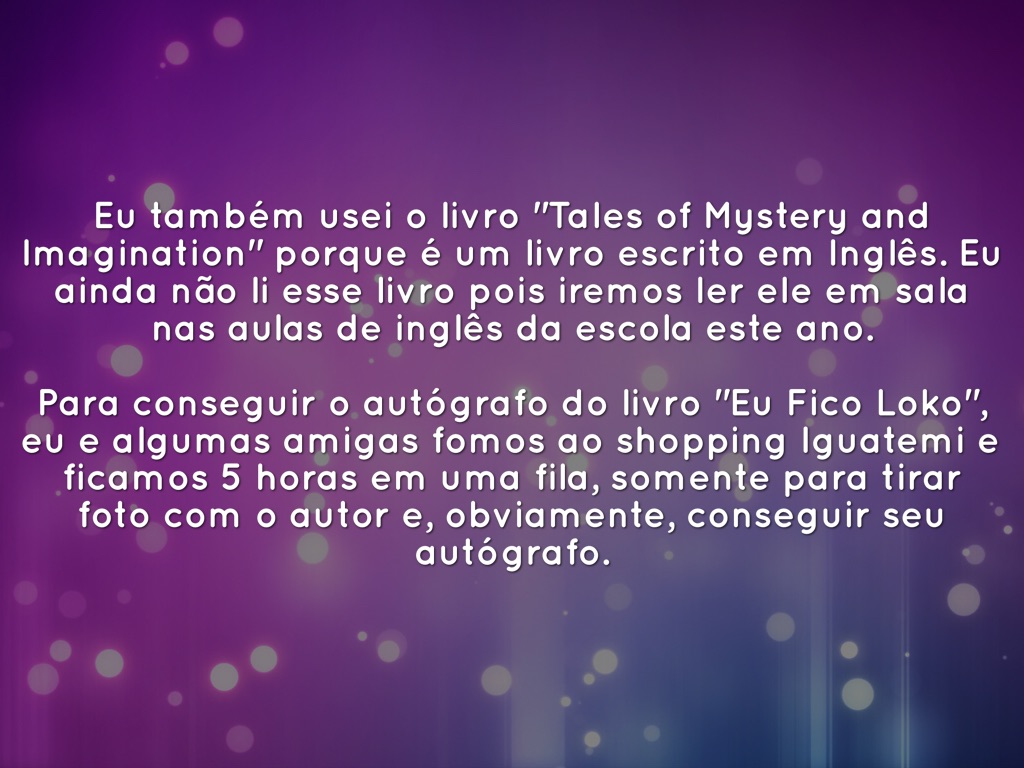 Eu também usei o livro "Tales of Mystery and Imagination" porque é um livro escrito em Inglês. Eu ainda não li esse livro pois iremos ler ele em sala nas aulas de inglês da escola este ano.