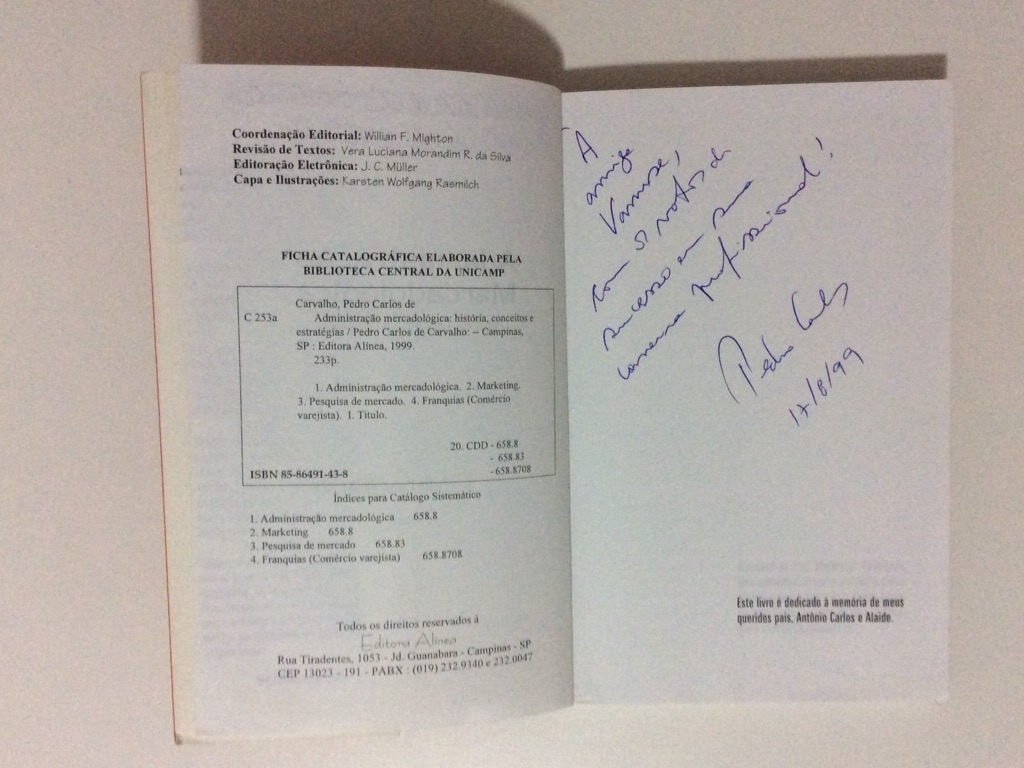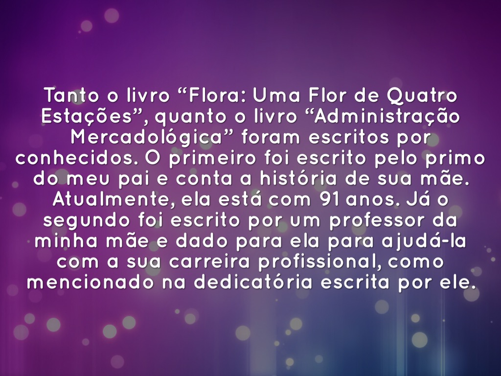 Tanto o livro “Flora: Uma Flor de Quatro Estações”, quanto o livro “Administração Mercadológica” foram escritos por conhecidos. O primeiro foi escrito pelo primo do meu pai e conta a história de sua mãe. Atualmente, ela está com 91 anos. Já o segundo foi escrito por um professor da minha mãe e dado para ela para ajudá-la com a sua carreira profissional, como mencionado na dedicatória escrita por ele.