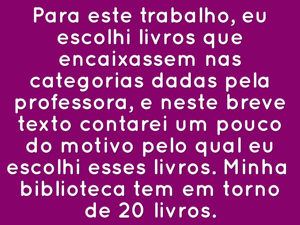 Para este trabalho, eu escolhi livros que encaixassem nas categorias dadas pela professora, e neste breve texto contarei um pouco do motivo pelo qual eu escolhi esses livros. Minha biblioteca tem em torno de 20 livros.