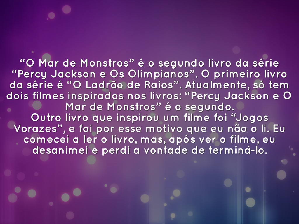 “O Mar de Monstros” é o segundo livro da série “Percy Jackson e Os Olimpianos”. O primeiro livro da série é “O Ladrão de Raios”. Atualmente, só tem dois filmes inspirados nos livros: “Percy Jackson e O Mar de Monstros” é o segundo.
