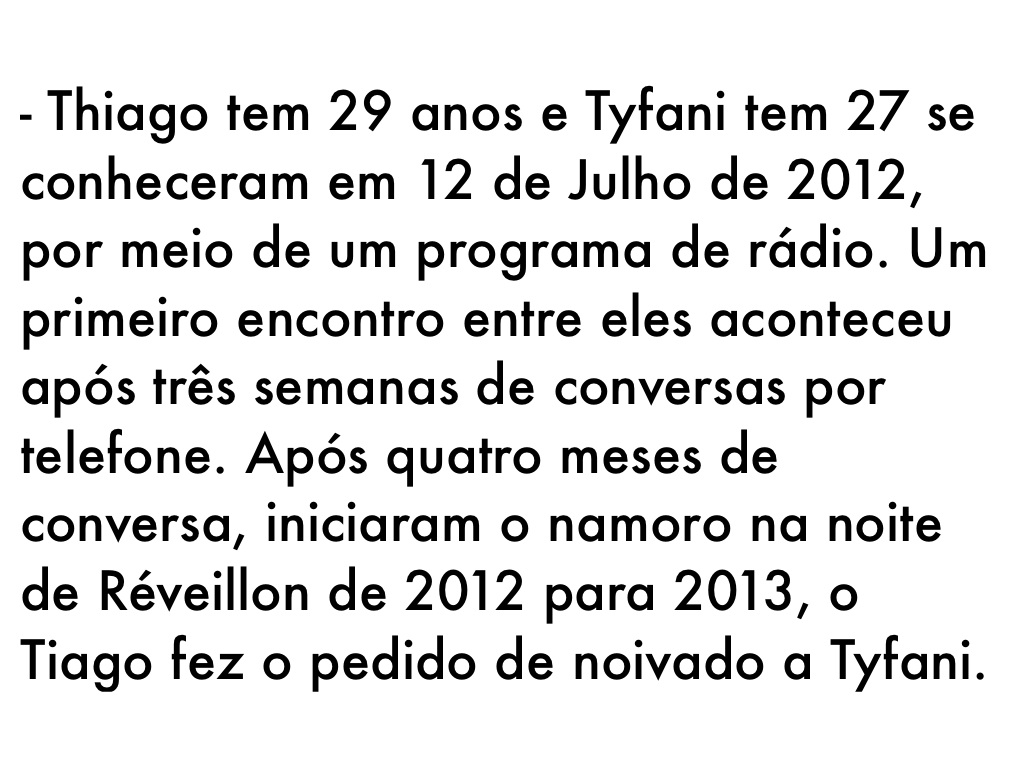 - Thiago tem 29 anos e Tyfani tem 27 se conheceram em 12 de Julho de 2012, por meio de um programa de rádio. Um primeiro encontro entre eles aconteceu após três semanas de conversas por telefone. Após quatro meses de conversa, iniciaram o namoro na noite de Réveillon de 2012 para 2013, o Tiago fez o pedido de noivado a Tyfani.