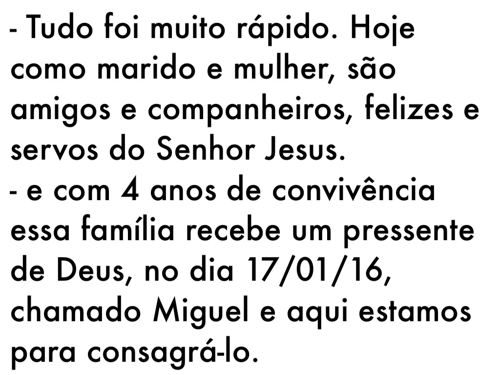 - e com 4 anos de convivência essa família recebe um pressente de Deus, no dia 17/01/16, chamado Miguel e aqui estamos para consagrá-lo.