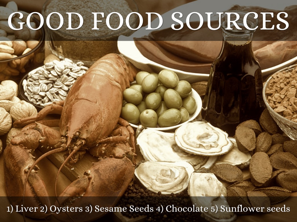 1) Liver 2) Oysters 3) Sesame Seeds 4) Chocolate 5) Sunflower seeds