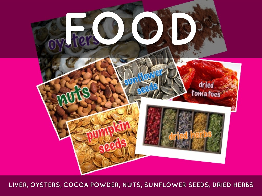 Liver, oysters, cocoa powder, nuts, sunflower seeds, dried herbs