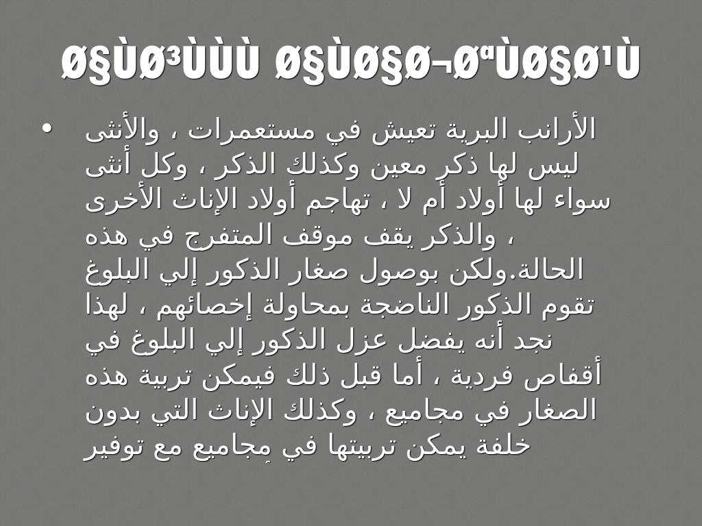 الأرانب البرية تعيش في مستعمرات ، والأنثى ليس لها ذكر معين وكذلك الذكر ، وكل أنثى سواء لها أولاد أم لا ، تهاجم أولاد الإناث الأخرى ، والذكر يقف موقف المتفرج في هذه الحالة.ولكن بوصول صغار الذكور إلي البلوغ تقوم الذكور الناضجة بمحاولة إخصائهم ، لهذا نجد أنه يفضل عزل الذكور إلي البلوغ في أقفاص فردية ، أما قبل ذلك فيمكن تربية هذه الصغار في مجاميع ، وكذلك الإناث التي بدون خلفة يمكن تربيتها في مجاميع مع توفير مساحة نصف متر مربع لكل أنثى.هذا ما يجب مراعاته عند تصميم المساكن حيث إن الإناث تكون عدوانية وشرسة تجاه الصغار خصوصا إذا كانت المساحة المخصصة لها ضيقة والمكان مزدحم.