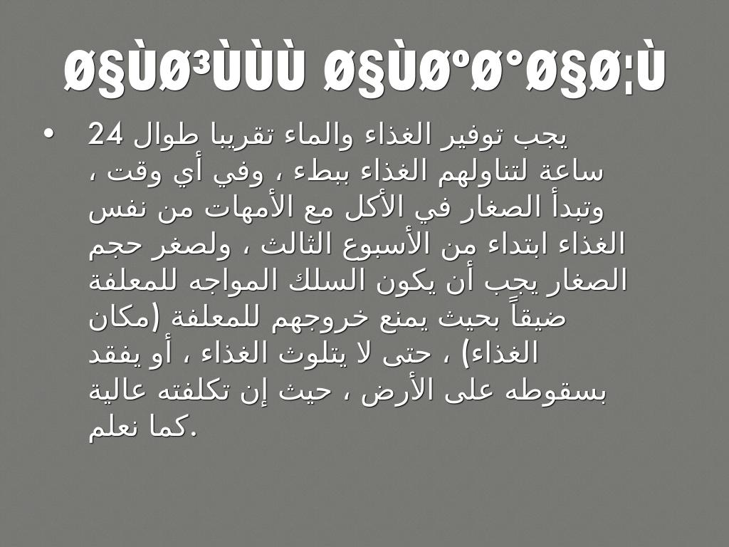 يجب توفير الغذاء والماء تقريبا طوال 24 ساعة لتناولهم الغذاء ببطء ، وفي أي وقت ، وتبدأ الصغار في الأكل مع الأمهات من نفس الغذاء ابتداء من الأسبوع الثالث ، ولصغر حجم الصغار يجب أن يكون السلك المواجه للمعلفة ضيقاً بحيث يمنع خروجهم للمعلفة (مكان الغذاء) ، حتى لا يتلوث الغذاء ، أو يفقد بسقوطه على الأرض ، حيث إن تكلفته عالية كما نعلم.