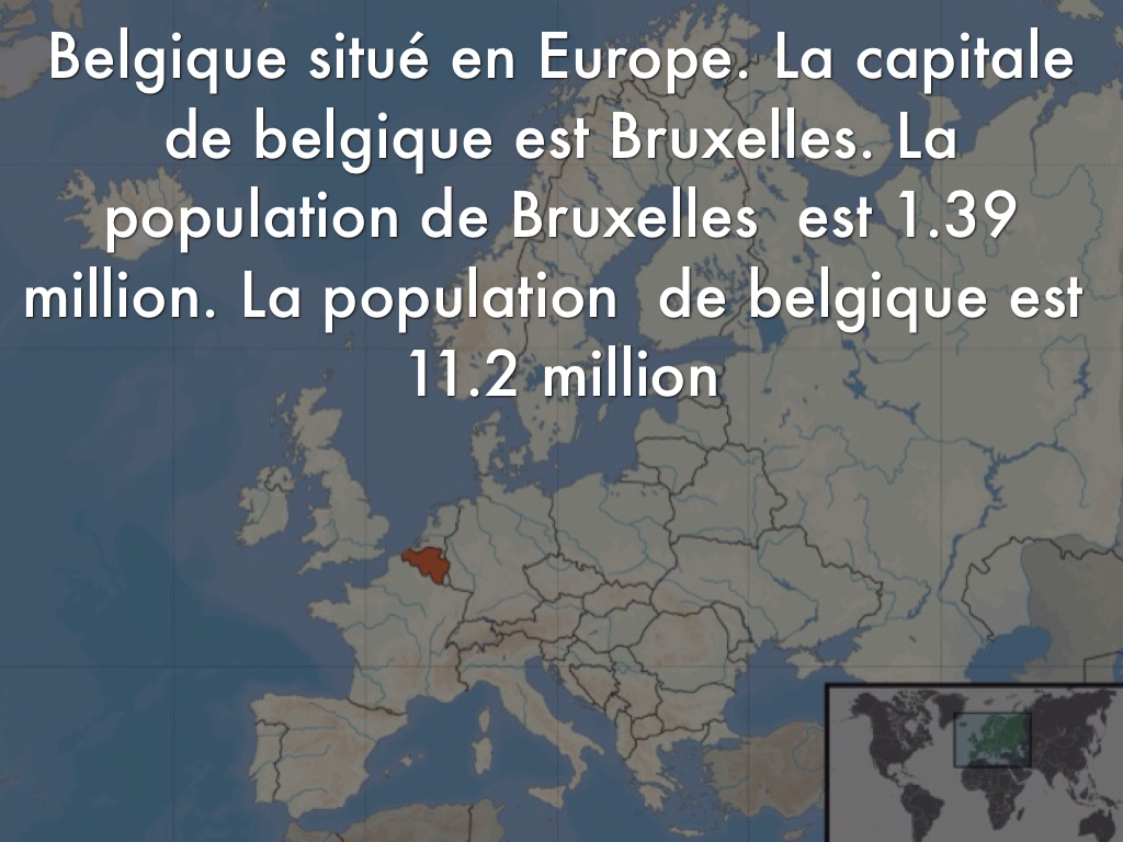 Belgique situé en Europe. La capitale de belgique est Bruxelles. La population de Bruxelles est 1.39 million. La population de belgique est 11.2 million