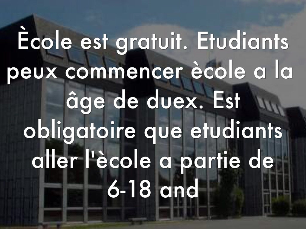 Ècole est gratuit. Etudiants peux commencer ècole a la âge de duex. Est obligatoire que etudiants aller l'ècole a partie de 6-18 and