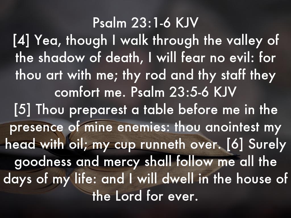 [4] Yea, though I walk through the valley of the shadow of death, I will fear no evil: for thou art with me; thy rod and thy staff they comfort me. Psalm 23:5-6 KJV