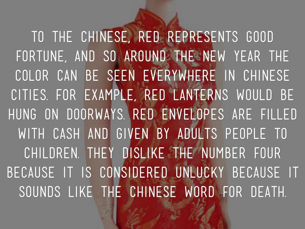 To the Chinese, red represents good fortune, and so around the New Year the color can be seen everywhere in Chinese cities. For example, red lanterns would be hung on doorways. Red envelopes are filled with cash and given by adults people to children. They dislike the number four because it is considered unlucky because it sounds like the Chinese word for death.