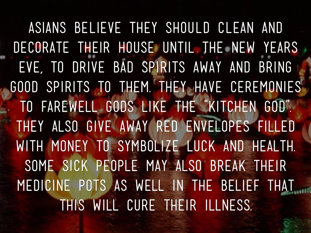 ASIANS BELIEVE THEY SHOULD CLEAN AND DECORATE THEIR HOUSE until the New years eve, to drive bad spirits away and bring good spirits to them. They have ceremonies to farewell gods like the "kitchen god". They also give away red envelopes filled with money to symbolize luck and health. Some sick people may also break their medicine pots as well in the belief that this will cure their illness.