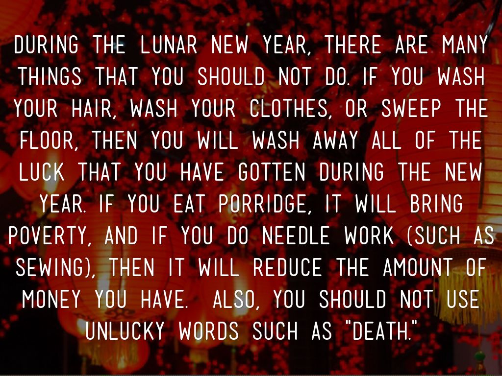 During the Lunar New Year, there are many things that you should not do. If you wash your hair, wash your clothes, or sweep the floor, then you will wash away all of the luck that you have gotten during the new year. If you eat porridge, it will bring poverty, and if you do needle work (such as sewing), then it will reduce the amount of money you have. Also, you should not use unlucky words such as "death."
