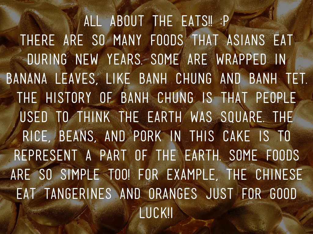 There are so many foods that Asians eat during new years. Some are wrapped in banana leaves, like banh Chung and banh Tet. The history of banh Chung is that people used to think the earth was square. The rice, beans, and pork in this cake is to represent a part of the earth. Some foods are so simple too! For example, the Chinese eat tangerines and oranges just for good luck!i