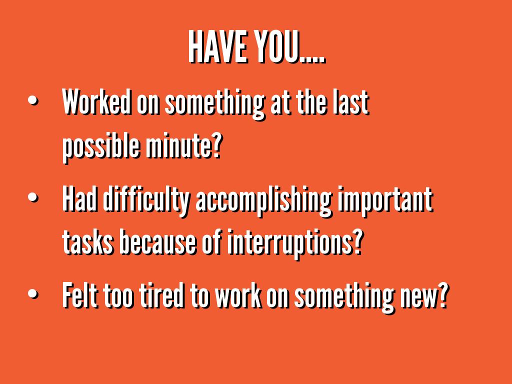 Have you worked on something at the last possible minute? What was that like? Have you had difficulty accomplishing important tasks because of interruptions? What were the results? Have you felt too tired to start something new, even if the task was important? How did that feel?
