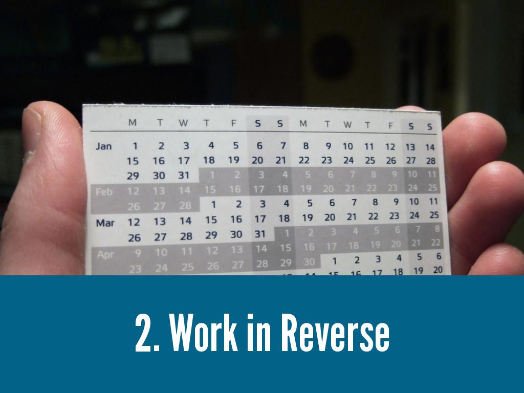 Most of us work well with deadlines. Having it on my calendar helps me work backwards in creating smaller deadlines. For example, when I was writing my book, my deadline was July 1, 2015. I worked backwards and realized if I did four chapters a month (one a week), I could have twenty chapters in five months, which is the typical length of a non-fiction book. Therefore, I started writing in February and created small deadlines every week for each chapter. Many small steps are what get things done.