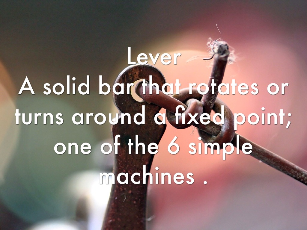 A solid bar that rotates or turns around a fixed point; one of the 6 simple machines .
