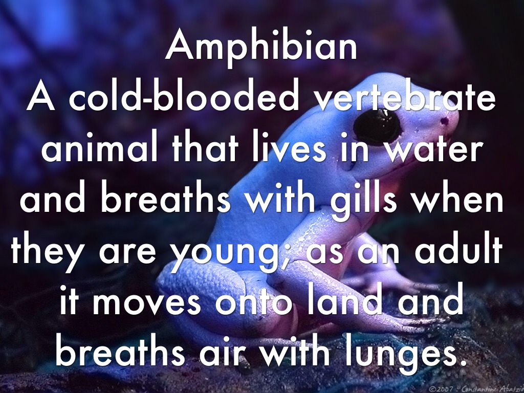 A cold-blooded vertebrate animal that lives in water and breaths with gills when they are young; as an adult it moves onto land and breaths air with lunges.