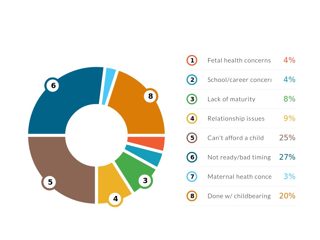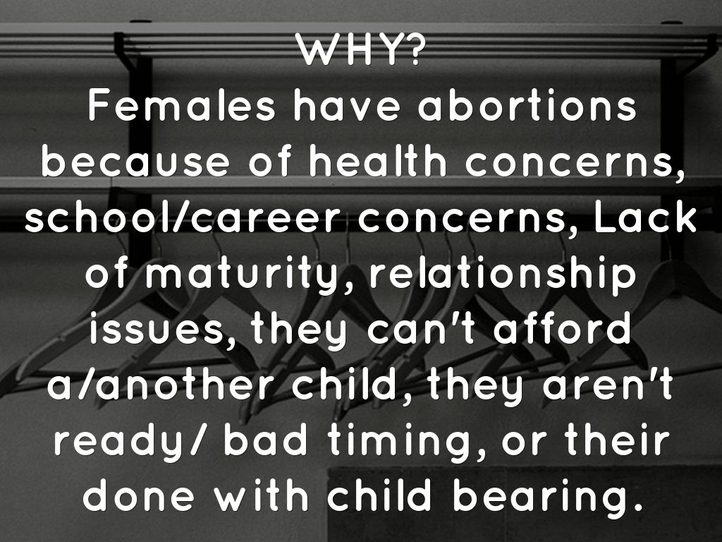 Females have abortions because of health concerns, school/career concerns, Lack of maturity, relationship issues, they can't afford a/another child, they aren't ready/ bad timing, or their done with child bearing.