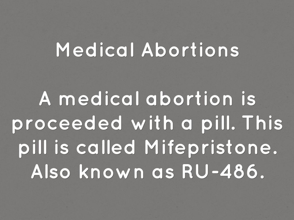 A medical abortion is proceeded with a pill. This pill is called Mifepristone. Also known as RU-486.