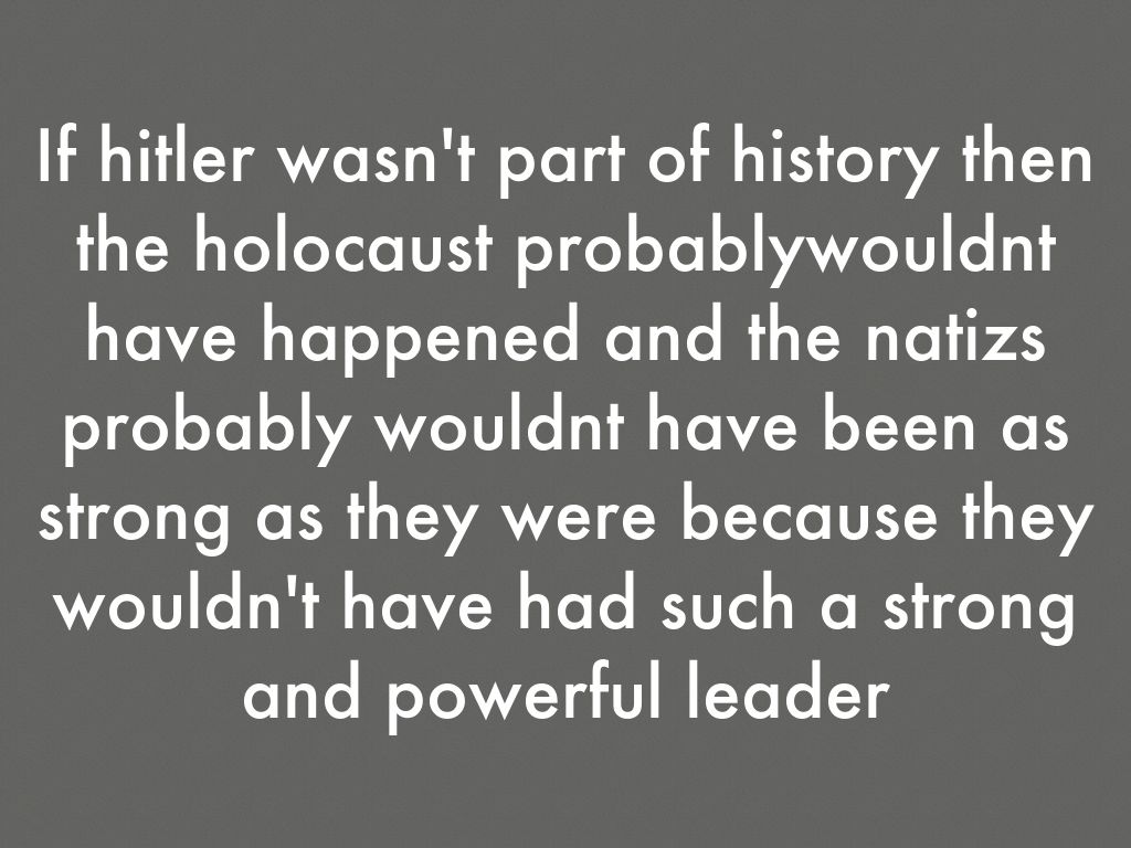 If hitler wasn't part of history then the holocaust probably wouldn't have happened and the natizs probably wouldnt have been as strong as they were because they wouldn't have had such a strong and powerful leader