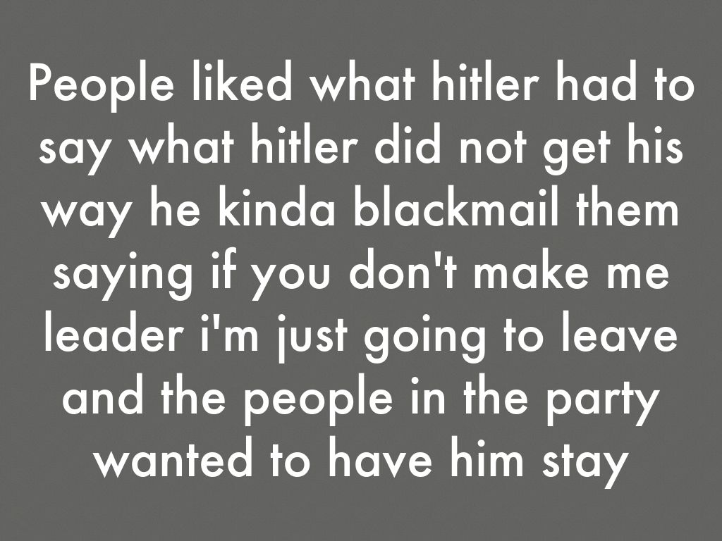 People liked what hitler had to say what hitler did not get his way he kinda blackmail them saying if you don't make me leader i'm just going to leave and the people in the party wanted to have him stay so he got leader