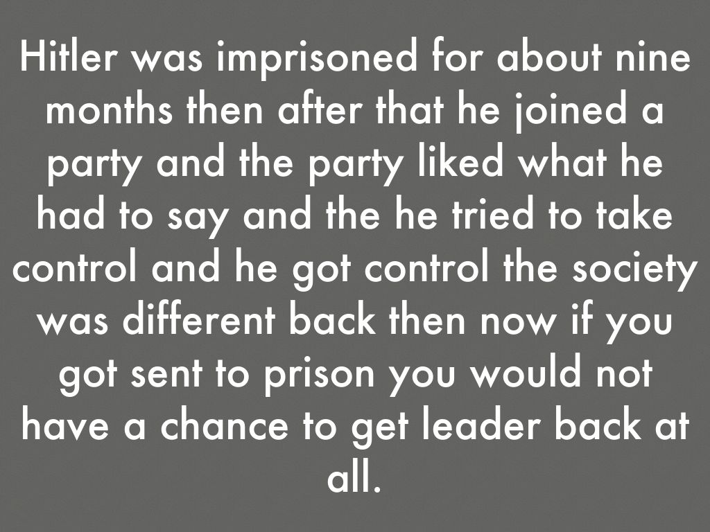 Hitler was imprisoned for about nine months then after that he joined a party and the party liked what he had to say and the he tried to take control and he got control the society was different back then now if you got sent to prison you would not have a chance to get leader back at all.