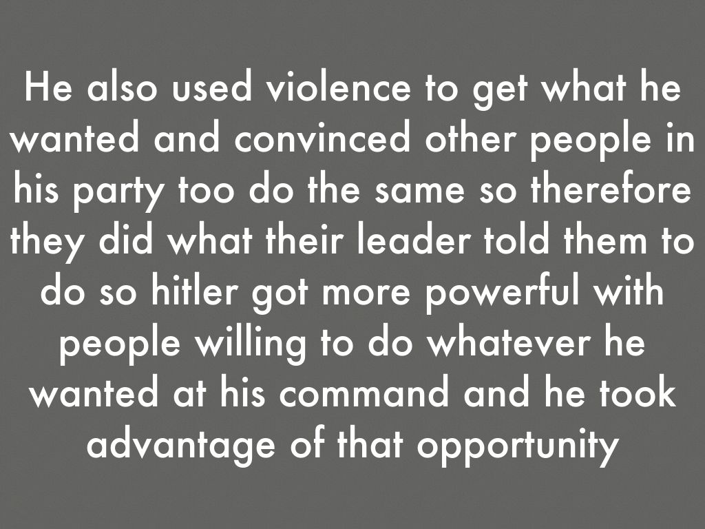 He also used violence to get what he wanted and convinced other people in his party too do the same so therefore they did what their leader told them to do so hitler got more powerful with people willing to do whatever he wanted at his command and he took advantage of that opportunity