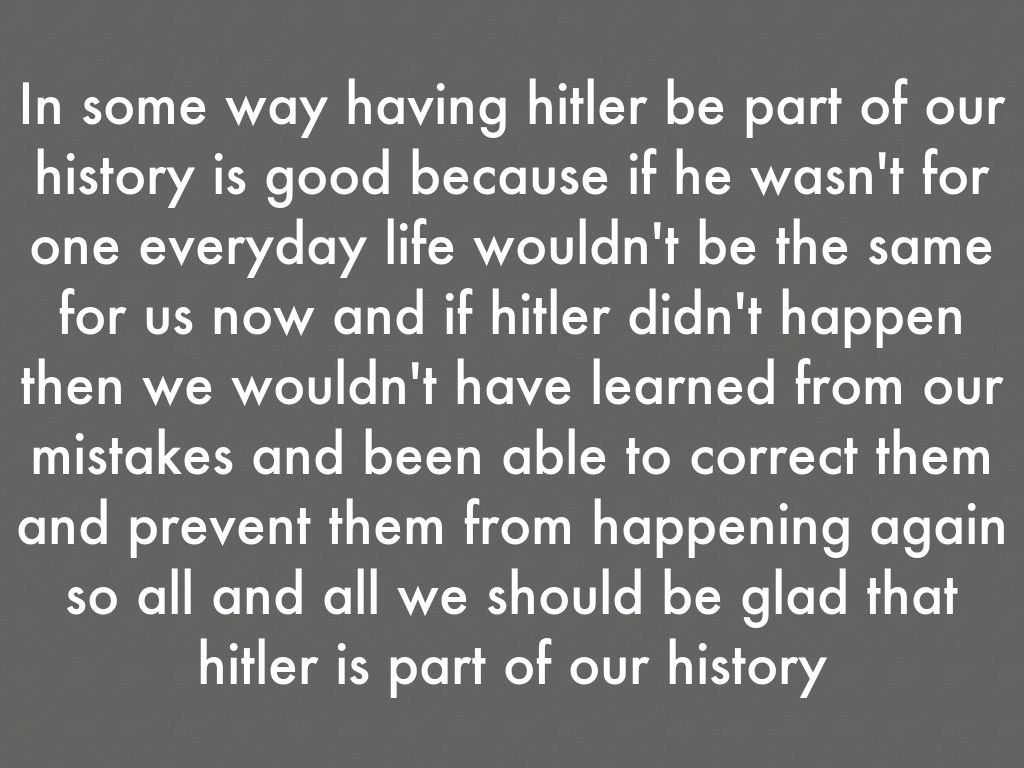 In some way having hitler be part of our history is good because if he wasn't part of our history everyday life wouldn't be the same for us now and if hitler didn't happen then we wouldn't have learned from our mistakes and been able to correct them and prevent them from happening again so all and all we should be glad that hitler is part of our history