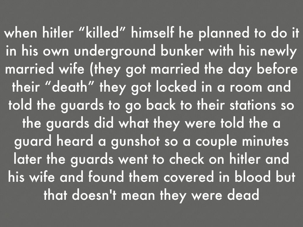 when hitler “killed” himself he planned to do it in his own underground bunker with his newly married wife (they got married the day before their “death” they got locked in a room and told the guards to go back to their stations so the guards did what they were told then a guard heard a gunshot so a couple minutes later the guards went to check on hitler and his wife and found them covered in blood but that doesn't mean they were dead