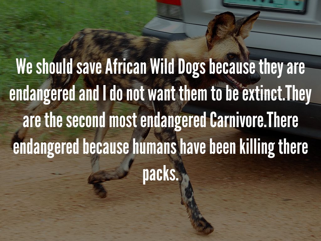 We should save African Wild Dogs because they are endangered and I do not want them to be extinct.They are the second most endangered Carnivore.There endangered because humans have been killing there packs.