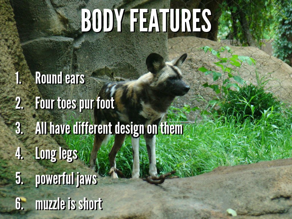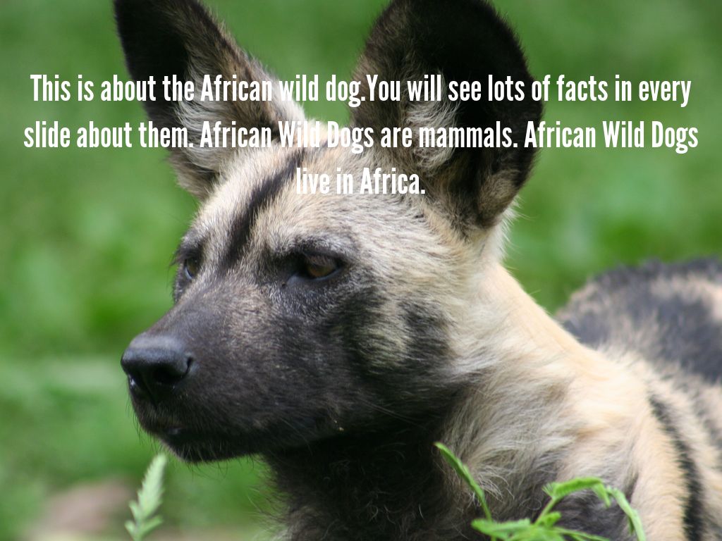 This is about the African wild dog.You will see lots of facts in every slide about them. African Wild Dogs are mammals. African Wild Dogs live in Africa.