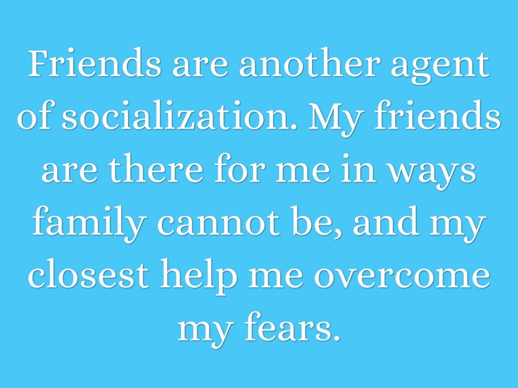 Friends are another agent of socialization. My friends are there for me in ways family cannot be, and my closest help me overcome my fears.