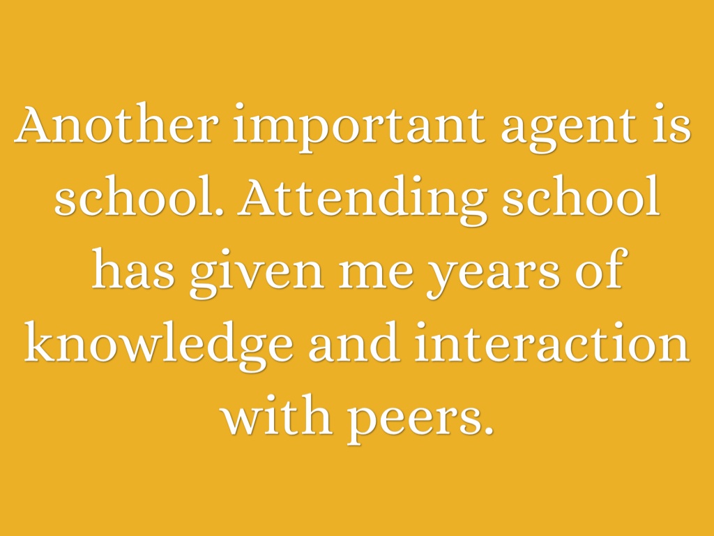 Another important agent is school. Attending school has given me years of knowledge and interaction with peers.