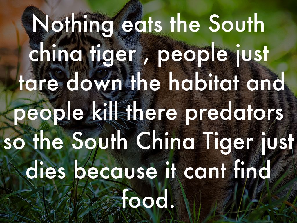 Nothing eats the South china tiger , people just tare down the habitat and people kill there predators so the South China Tiger just dies because it cant find food.