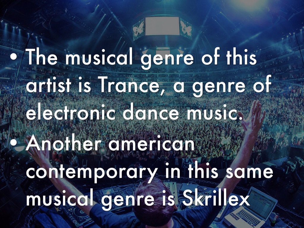 • The musical genre of this artist is Trance, a genre of electronic dance music.