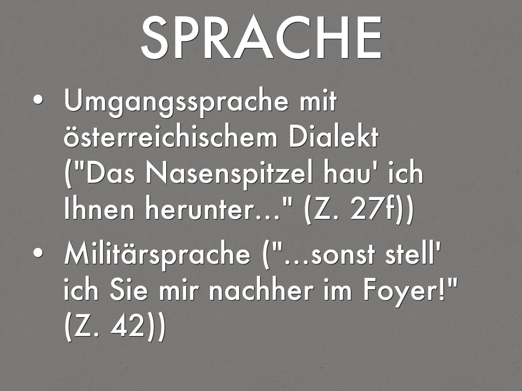 - Militärsprache ("...sonst stell' ich Sie mir nachher im Foyer!" (Z. 42))